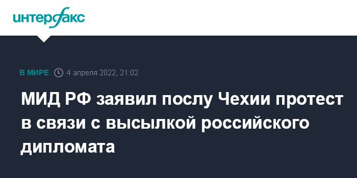 "Послу заявлен решительный протест в связи с очередной антироссийской провокацией чешской стороны - объявлением 29 марта "persona nоn grata" советника-посланника посольства России в Праге. Акцентировано, что этот очередной враждебный шаг, закрепляющий осознанно проводимую властями Чехии линию на разрушение двусторонних отношений, не останется без ответа", - говорится в сообщении МИД РФ, опубликованном на сайте ведомства.