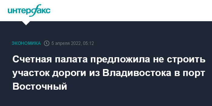 Москва. 5 апреля. INTERFAX.RU - Счетная палата (СП) по итогам проверки строительства автодороги "Владивосток - Находка - порт Восточный" предложила вместо возведения ее второго участка реконструировать действующую трассу А188 "Артем - Находка - порт Восточный, сообщается во вторник в пресс-релизе ведомства.