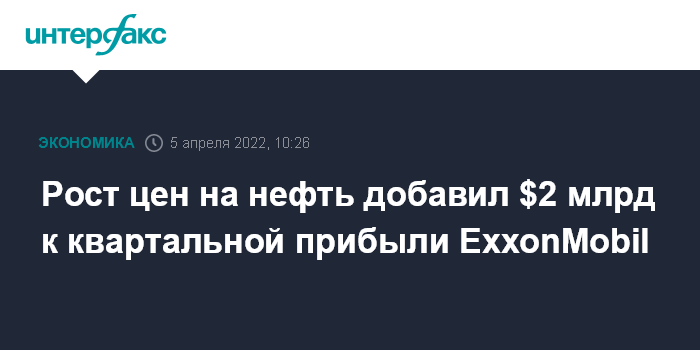 Москва. 5 апреля. INTERFAX.RU - Крупнейшая нефтегазовая компания США ExxonMobil Corp. сообщила, что ожидает существенного увеличения чистой прибыли в первом квартале 2022 года по сравнению с четвертым кварталом прошлого года благодаря росту котировок энергоресурсов.