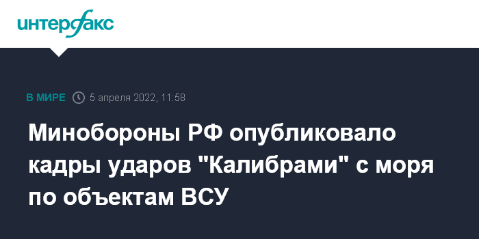 Москва. 5 апреля. INTERFAX.RU - Корабль Черноморского флота России выполнил залповый пуск семи крылатых ракет "Калибр" по целям на территории Украины, сообщили в Минобороны РФ во вторник.