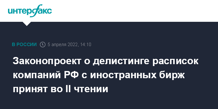 Москва. 5 апреля. INTERFAX.RU - Госдума приняла во втором чтении законопроект, который запрещает размещать депозитарные расписки на ценные бумаги компаний РФ на иностранных площадках и обязывает провести делистинг уже существующих.