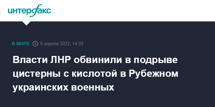 Москва. 5 апреля. INTERFAX.RU - Вооружённые силы Украины подорвали цистерну с соляной кислотой на территории завода "Заря" в городе Рубежное, в результате в районе взрыва распространено отравляющее облако, сообщил представитель Народной милиции ЛНР Иван Филипоненко.