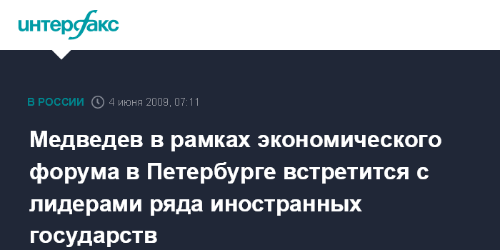Москва. 4 июня. ИНТЕРФАКС - Президент РФ Дмитрий Медведев проведет "на полях" Петербургского экономического форума встречи с лидерами ряда иностранных государств.
