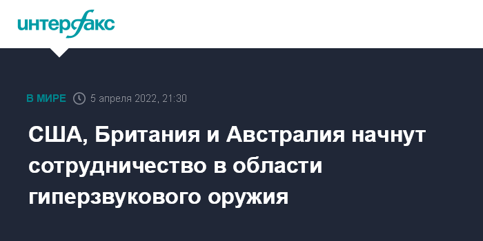 Москва. 5 апреля. INTERFAX.RU - США, Великобритания и Австралия, являющиеся членами партнерства AUKUS, обязались начать сотрудничество в области гиперзвукового и контргиперзвукового вооружения, говорится в совместном заявлении трех стран, опубликованном во вторник.