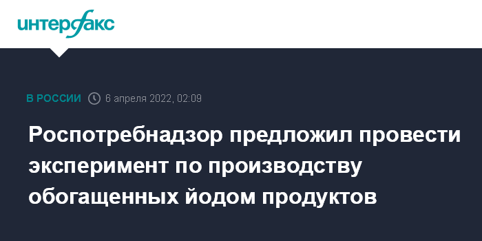 Москва. 6 апреля. INTERFAX.RU - В России предлагают провести эксперимент по внедрению в производство обогащенных йодом пищевых продуктов и использованию их в медицинских, дошкольных, образовательных и других организациях, а также в оптовой и розничной торговой сети.