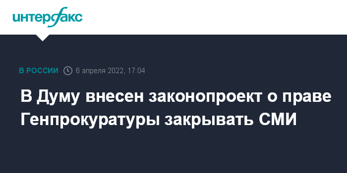 Москва. 6 апреля. INTERFAX.RU - Группа депутатов внесла в Госдуму законопроект, который позволит генпрокуратуре отзывать регистрацию СМИ и инициировать запрет доступа к интернет-ресурсам за распространение "фейков", дискредитацию Вооруженных сил РФ, призывы к санкциям.