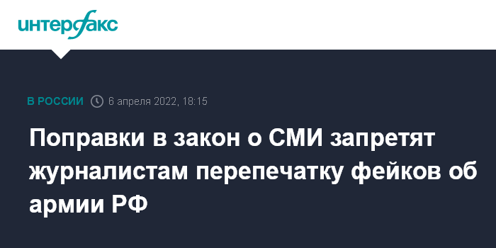 Поправки в закон о СМИ запретят журналистам перепечатку фейков об армии РФ