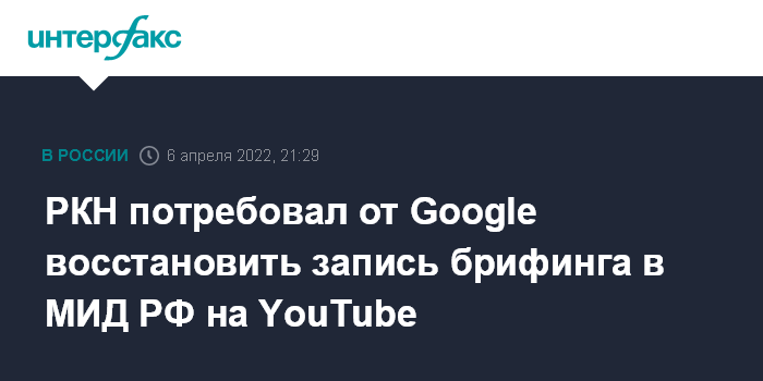 Москва. 6 апреля. INTERFAX.RU - Роскомнадзор (РКН) потребовал от компании Google восстановить на видеохостинге YouTube запись брифинга официального представителя МИД России Марии Захаровой, сообщает ведомство в среду.