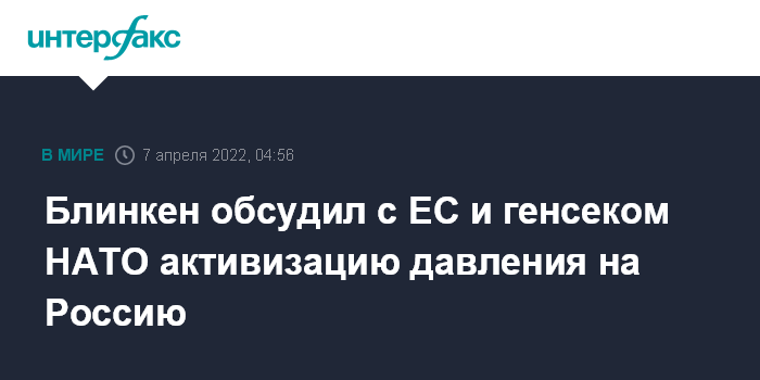 Москва. 7 апреля. INTERFAX.RU - Госсекретарь США Энтони Блинкен, находящийся в Брюсселе с визитом, на встречах с коллегами из ряда стран ЕС и генсеком НАТО сконцентрировал внимание на наращивании помощи Украине и усилении давления на Россию, следует из сообщений американского госдепартамента.