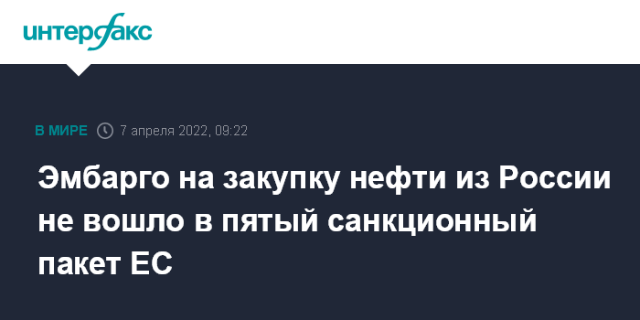 Москва. 7 апреля. INTERFAX.RU - Введение эмбарго на закупки нефти в России не входит в пятый санкционный пакет, обсуждение которого состоится в четверг, сообщил журналистам глава европейской дипломатии Жозеп Боррель.