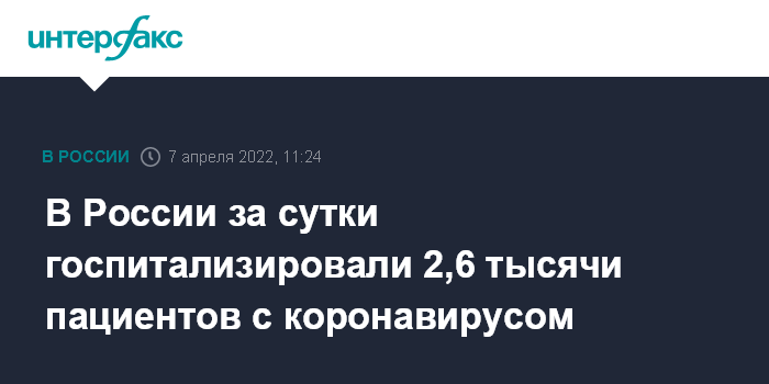 Москва. 7 апреля. INTERFAX.RU - В России за сутки в больницы попали 2 612 пациентов с коронавирусом, следует из данных оперативного штаба, обнародованных в четверг.