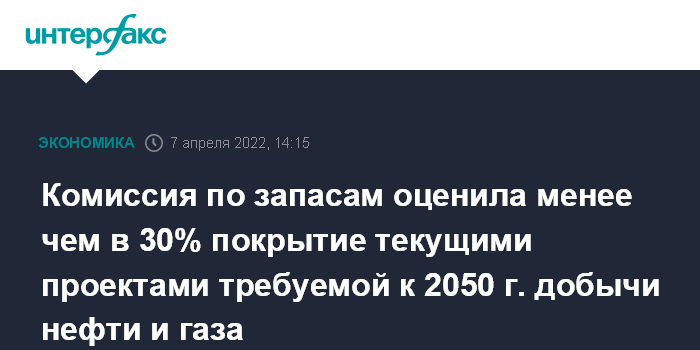 Комиссия по запасам оценила менее чем в 30% покрытие текущими проектами требуемой к 2050 г. добычи нефти и газа