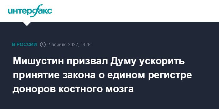 Москва. 7 апреля. INTERFAX.RU - Премьер-министр Михаил Мишустин призвал депутатов Госдумы ускорить рассмотрение законопроекта о создании единого федерального регистра доноров костного мозга, который поможет в лечении детей, страдающих лейкозом. Он сказал это, выступая в парламенте с отчетом о работе правительства за год.