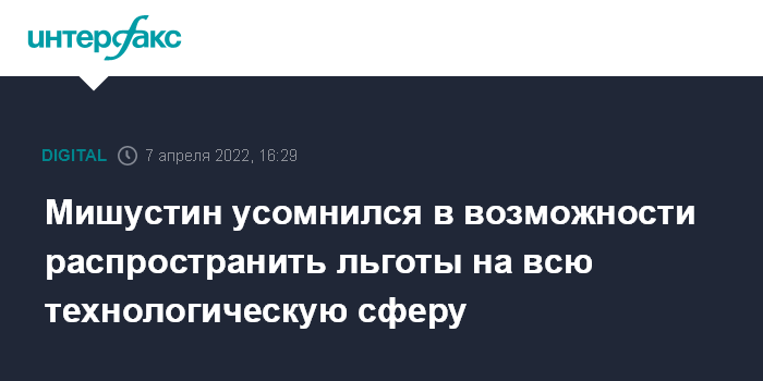 Москва. 7 апреля. INTERFAX.RU - Председатель правительства РФ Михаил Мишустин не поддержал идею распространить льготы для IT-компаний на другие отрасли технологической сферы.