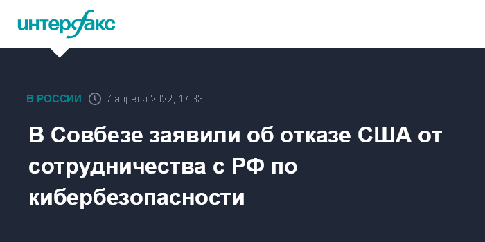 Москва. 7 апреля. INTERFAX.RU - США уведомили российскую сторону об отказе от сотрудничества в сфере кибербезопасности и закрыли канал связи, сообщил "Российской газете" замсекретаря Совета безопасности Олег Храмов.