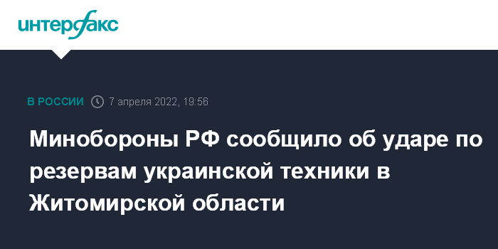 Москва. 7 апреля. INTERFAX.RU - Министерство обороны РФ заявило о ракетном ударе в Житомирской области по резерву украинской военной техники, которую готовили для переброски в Донбасс.
