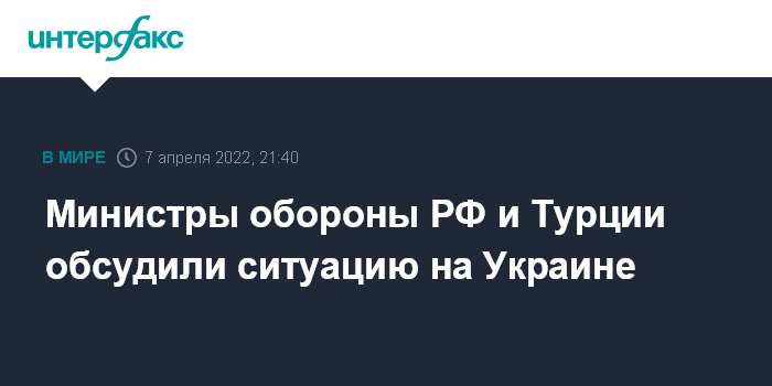 Москва. 7 апреля. INTERFAX.RU - Состоялся телефонный разговор министра обороны РФ Сергея Шойгу с министром национальной обороны Турции Хулуси Акаром, тема обсуждений – Украина, сообщили в российском оборонном ведомстве.