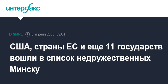 Москва. 8 апреля. INTERFAX.RU - Правительство Белоруссии утвердило перечень недружественных стран. Соответствующее постановление Совета министров опубликовано в пятницу на Национальном правовом интернет-портале.