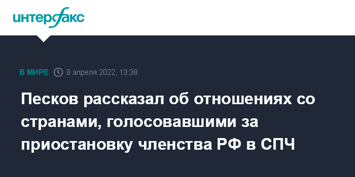 Москва. 8 апреля. INTERFAX.RU - Пресс-секретарь президента России Дмитрий Песков заявил, что в Кремле с пониманием относятся к голосованию дружественных РФ стран по вопросу приостановки членства России в Совете по правам человека (СПЧ) ООН.