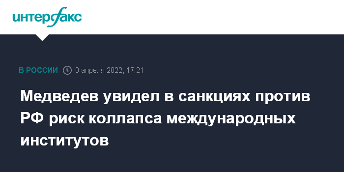 Москва. 8 апреля. INTERFAX.RU - Беспрецедентные санкции в отношении РФ, в том числе приостановка ее членства в Совете ООН по правам человека, грозят коллапсом международных институтов, включая Организацию Объединенных Наций, считает зампред Совбеза РФ Дмитрий Медведев.