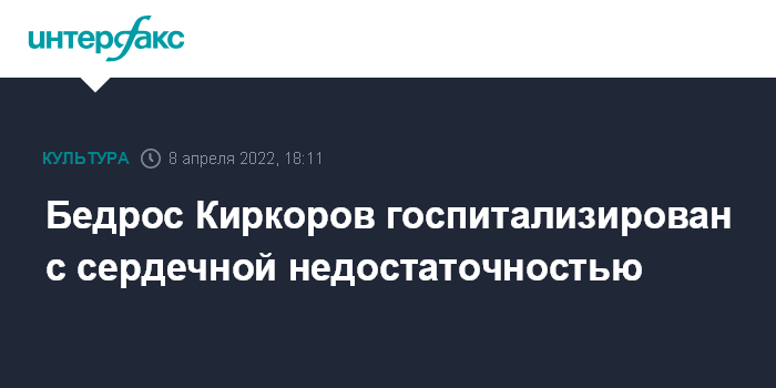 Москва. 8 апреля. INTERFAX.RU - Народный артист РФ, болгарский и российский певец Бедрос Киркоров госпитализирован в тяжелом состоянии с сердечной недостаточностью после перенесённого коронавируса, сообщила "Интерфаксу" пресс-секретарь певца Филиппа Киркорова Екатерина Успенская.