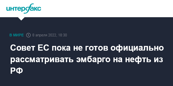 Москва. 8 апреля. INTERFAX.RU - Совет ЕС по иностранным делам 11 апреля в Люксембурге будет обсуждать дальнейшую перспективу санкций против РФ, однако вопрос о нефтяном эмбарго пока не входит в повестку дебатов глав МИД стран Евросоюза, сообщила журналистам высокопоставленная европейская чиновница.