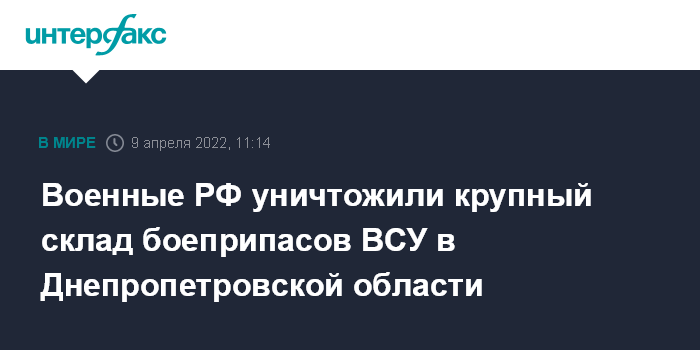 Москва. 9 апреля. INTERFAX.RU - Российские военные ночью нанесли удары по оружейному складу ВСУ под Днепропетровском и аэродрому Миргород в Полтавской области, заявил официальный представитель Минобороны РФ Игорь Конашенков.