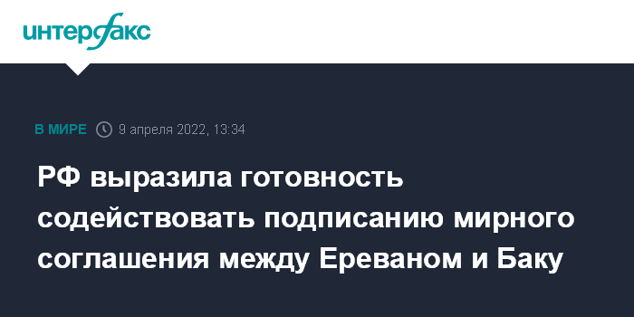 РФ выразила готовность содействовать подписанию мирного соглашения между Ереваном и Баку