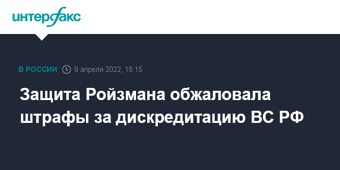 Москва. 9 апреля. INTERFAX.RU - Апелляционные жалобы поданы на два решения Октябрьского районного суда Екатеринбурга о назначение штрафов бывшему мэру города Евгению Ройзману по административным протоколам о дискредитации Вооруженных сил (ВС) РФ, сообщила "Интерфаксу" в субботу его защитник Юлия Федотова.
