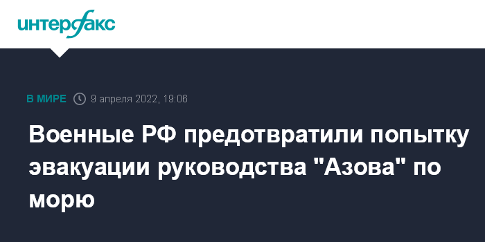 По его словам, власти Украины после неудачных попыток эвакуировать руководство "Азова" вертолетами 8 апреля решили предпринять попытку эвакуации с моря. Также, заявил Конашенков, это судно должно было эвакуировать из Мариуполя иностранных наемников.