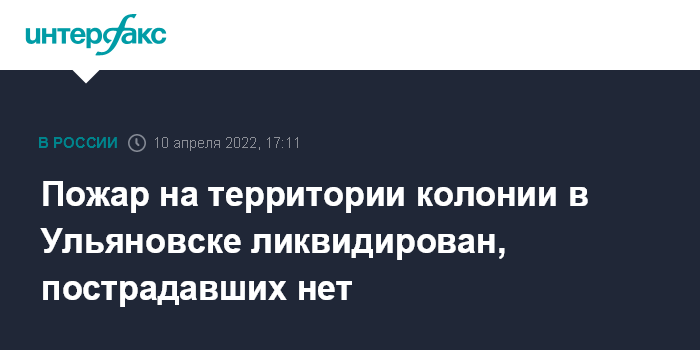 Москва. 10 апреля. INTERFAX.RU - В результате пожара на территории исправительной колонии №4 в Ульяновске никто не пострадал, сообщили "Интерфаксу" в пресс-службе УФСИН по Ульяновской области в воскресенье.