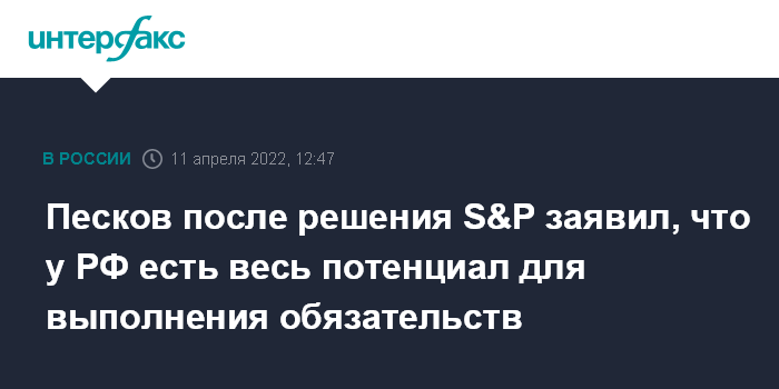 Песков после решения S&P заявил, что у РФ есть весь потенциал для выполнения обязательств