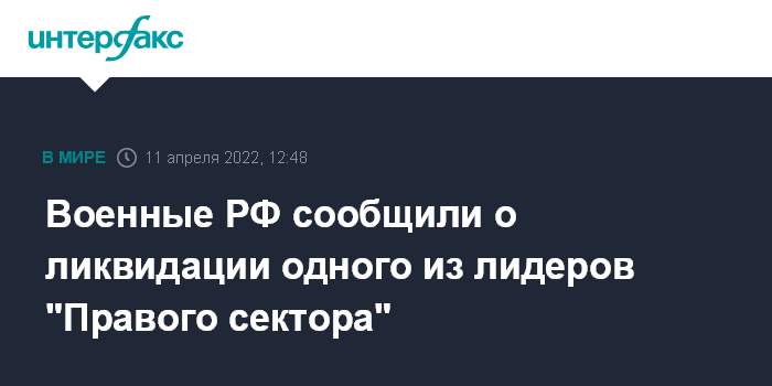 Москва. 11 апреля. INTERFAX.RU - Министерство обороны России сообщило, что российский спецназ ликвидировал в районе города Изюм одного из руководителей украинской организации "Правый сектор" (признан в РФ экстремистской организацией и запрещен - ИФ).