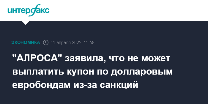 Москва. 11 апреля. INTERFAX.RU - "АЛРОСА", попавшая в санкционные списки США и Великобритании, не может выплатить в срок купон по долларовым еврооблигациям с погашением в 2024 году, заявила компания в понедельник.