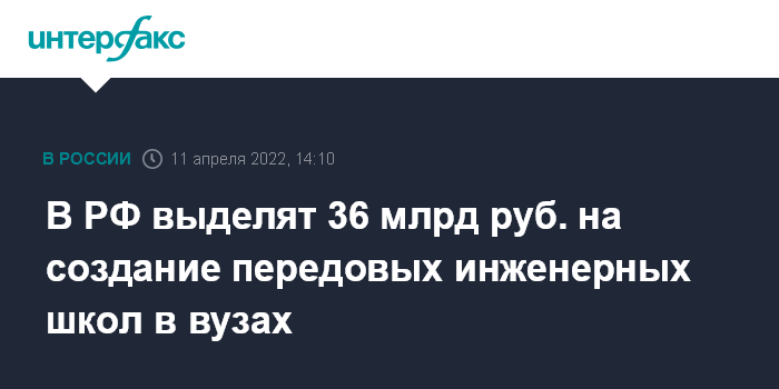 Москва. 11 апреля. INTERFAX.RU - На базе российских вузов будет создано 30 передовых инженерных школ, на эти цели в течение трех лет будет выделено 36 млрд рублей.