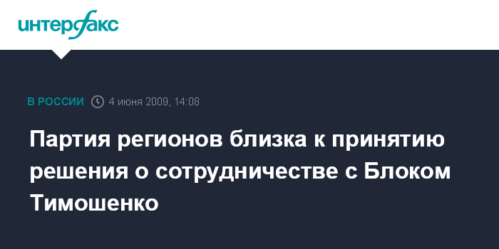 Москва. 4 июня. INTERFAX.RU - Фракция Партии регионов близка к принятию решения о сотрудничестве с БЮТ, но пока не согласована позиция о способе избрания президента.
