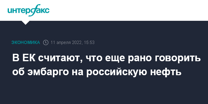 Москва. 11 апреля. INTERFAX.RU - Председатель Еврокомиссии Урсула фон дер Ляйен и глава дипломатии ЕС Жозеп Боррель объявили о намерении распространить санкции ЕС на экспорт российской нефти, но еще не время давать конкретные комментарии по этому поводу, заявила официальный представитель ЕК Дана Спинант.