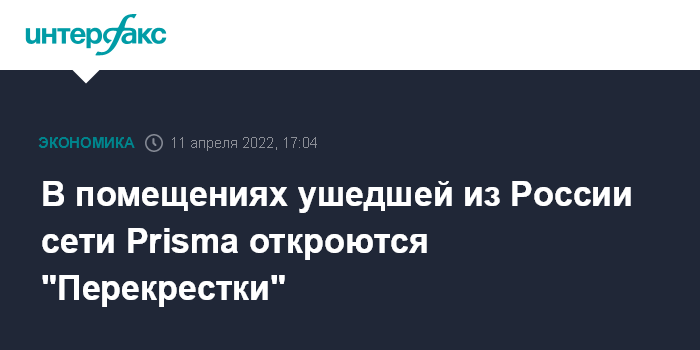 Москва. 11 апреля. INTERFAX.RU - Торговая сеть "Перекресток" (принадлежит X5 Retail Group) может открыть свои магазины в точках, которые ранее занимали супермаркеты Prisma (входит в финский холдинг S-Group), сообщил в телеграм-канале управляющий партнер Fort Group Максим Левченко. Эти торговые площади находятся под управлением Fort Group.