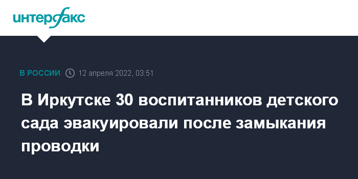 Москва. 12 апреля. INTERFAX.RU - Эвакуация проводилась во вторник утром из детского сада N142 в Иркутске из-за сработавшей автоматической пожарной сигнализации после короткого замыкания электропроводки, сообщается в телеграм-канале областного главка МЧС.