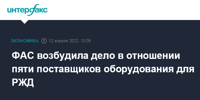 Москва. 12 апреля. INTERFAX.RU - Федеральная антимонопольная служба (ФАС) РФ возбудила дело в отношении поставщиков оборудования для строительства железнодорожной инфраструктуры ОАО "РЖД" из-за возможного сговора на торгах.