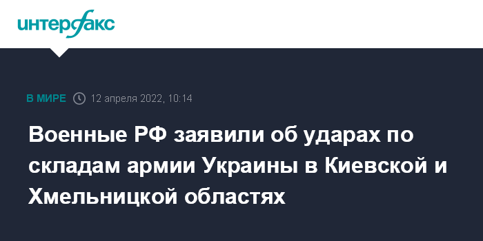 Москва. 12 апреля. INTERFAX.RU - Министерство обороны России сообщило о ночных ракетных ударах по военным объектам Украины в Киевской и Хмельницкой областях.