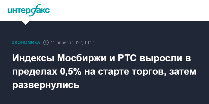 Москва. 12 апреля. INTERFAX.RU - Торги на российском рынке акций во вторник начались с умеренной коррекцией вверх вслед за ростом цен на нефть и металлы. Сдерживающим фактором остается санкционное давление на Россию и негативная динамика мировых фондовых площадок.