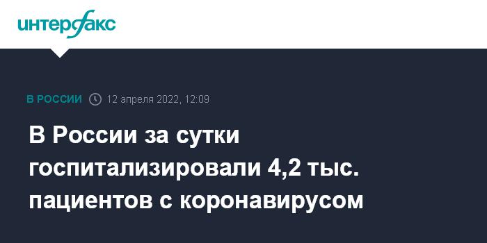 Москва. 12 апреля. INTERFAX.RU - В России за сутки в больницы попали 4 233 человека, следует из данных оперативного штаба, обнародованных во вторник.