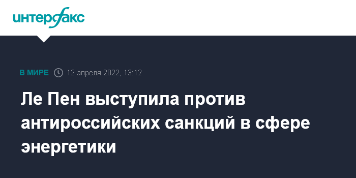 Москва. 12 апреля. INTERFAX.RU - Лидер ультраправой партии "Национальное объединение" Марин Ле Пен, вышедшая во второй тур президентских выборов во Франции, выступила против санкций в отношении поставок энергоносителей из РФ, добавив, что не стоит считать ее российским "троянским конем".