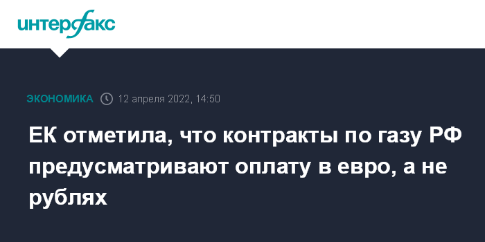 Москва. 12 апреля. INTERFAX.RU - Позиция Евросоюза в связи с российским требованием оплаты экспорта газа РФ в рублях заключается в том, что контракты подписывались по расчетам в евро и должны оплачиваться в евро, заявила официальный представитель Еврокомиссии (ЕК) Дана Спинант.