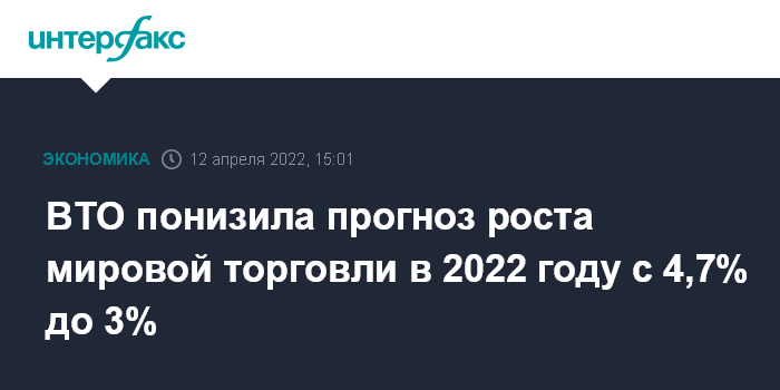 Москва. 12 апреля. INTERFAX.RU - Всемирная торговая организация (ВТО) понизила прогноз роста мировой торговли в 2022 году с 4,7% (в октябрьской версии) до 3,0%, отмечая, что "российско-украинский конфликт ставит под угрозу хрупкое восстановление мировой торговли", говорится в докладе ВТО, опубликованном во вторник.