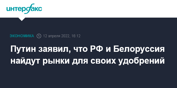 Москва. 12 апреля. INTERFAX.RU - Россия и Белоруссия найдут рынки для своих удобрений, если проблемы при поставках на западные рынки будут сохраняться, заявил президент РФ Владимир Путин на пресс-конференции по итогам переговоров с Александром Лукашенко.