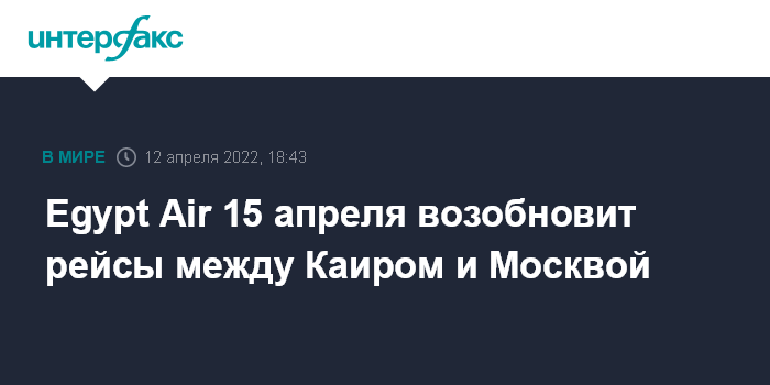 Москва. 12 апреля. INTERFAX.RU - Авиакомпания Egypt Air объявила о возобновлении авиасообщения между Каиром и Москвой с 15 апреля, рейсы будут выполняться ежедневно, сообщает портал Sada El Balad.