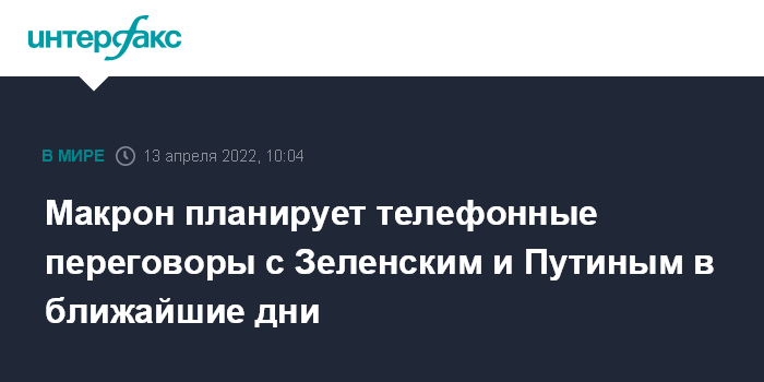 Москва. 13 апреля. INTERFAX.RU - Президент Франции Эммануэль Макрон в среду заявил, что планирует в ближайшее время провести телефонные переговоры с президентом Украины Владимиром Зеленским и, если потребуется, с российским президентом Владимиром Путиным.