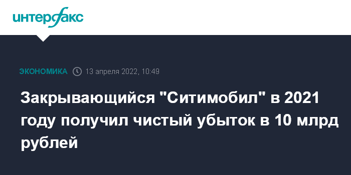 Москва. 13 апреля. INTERFAX.RU - Чистый убыток ООО "Сити-мобил" (бренд "Ситимобил") в 2021 году составил 10,1 млрд рублей против убытка в 11,8 млрд рублей годом ранее, следует из бухгалтерской отчетности компании.